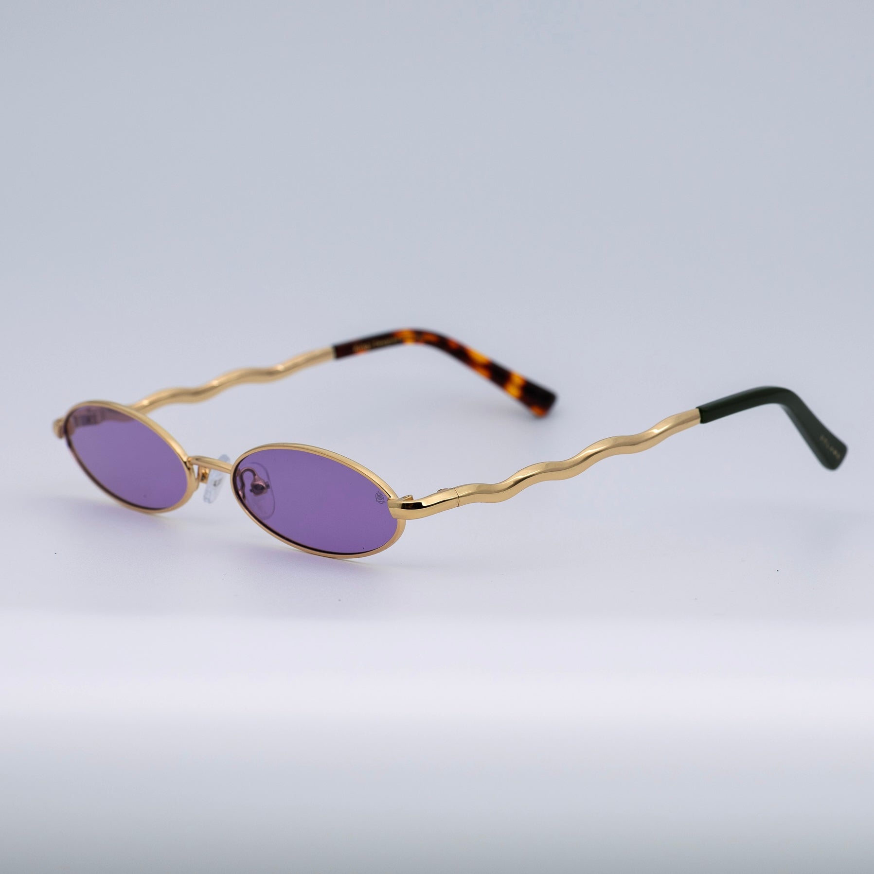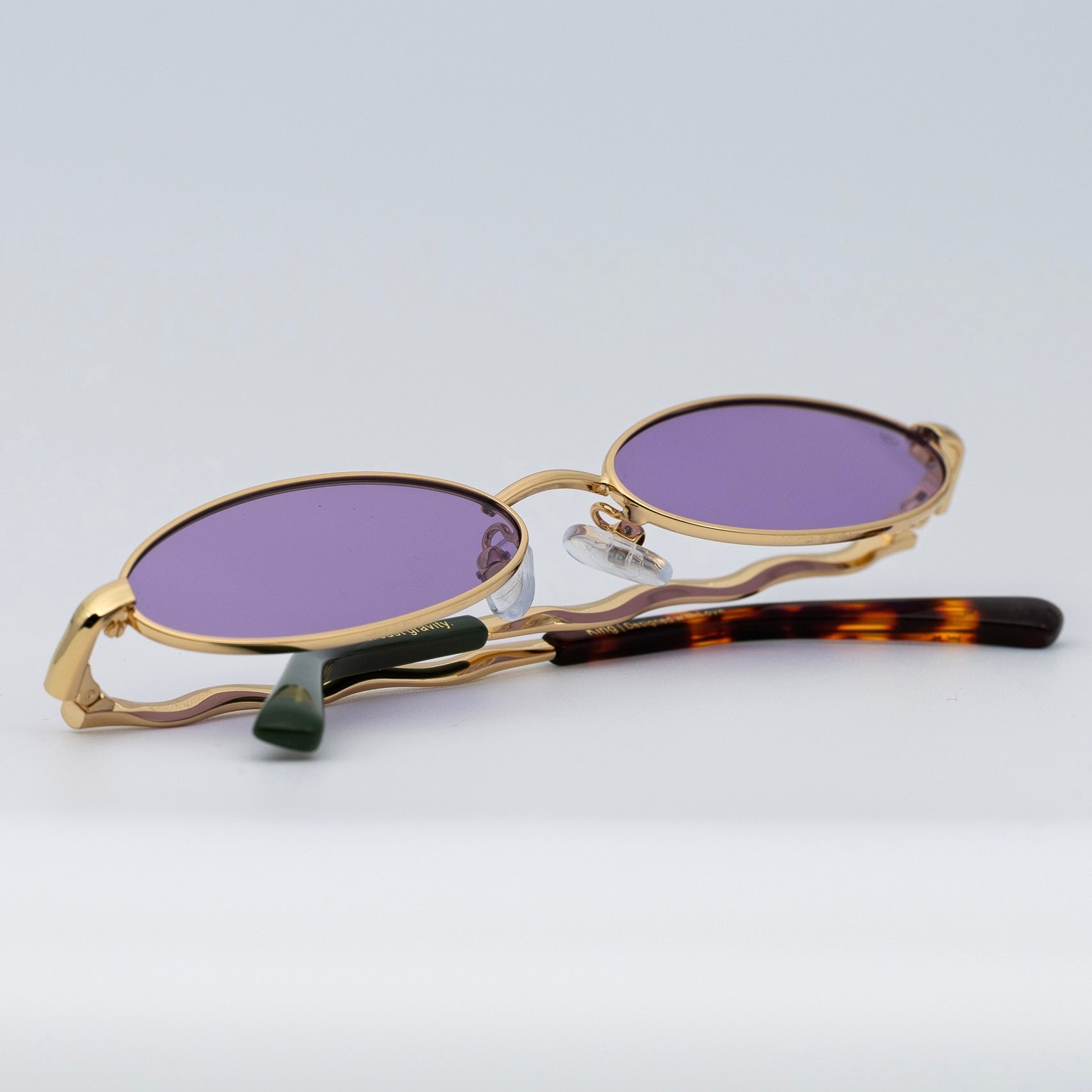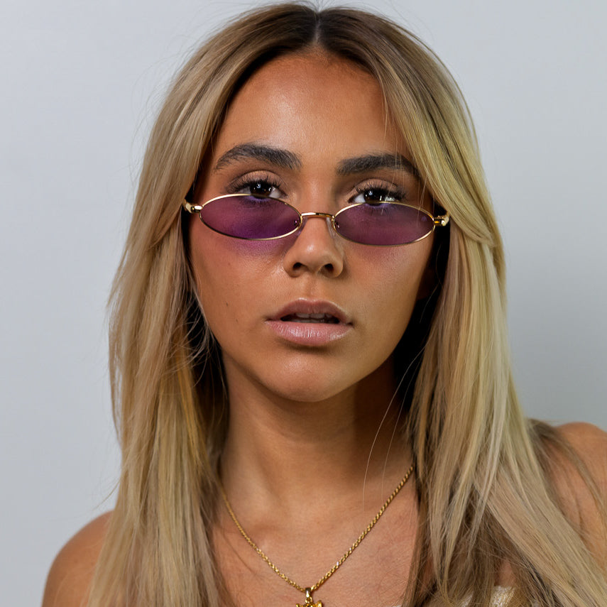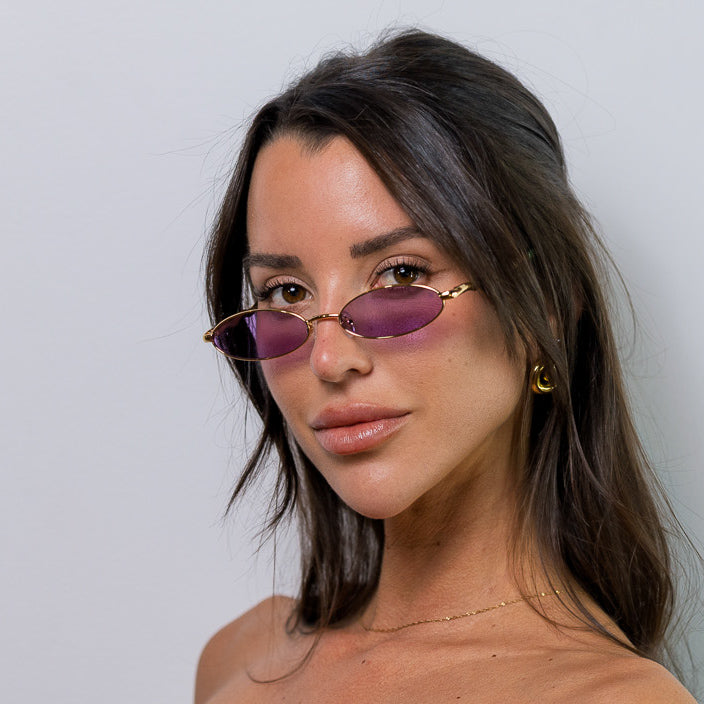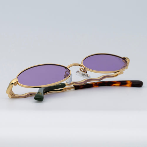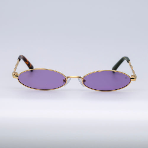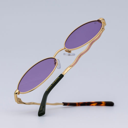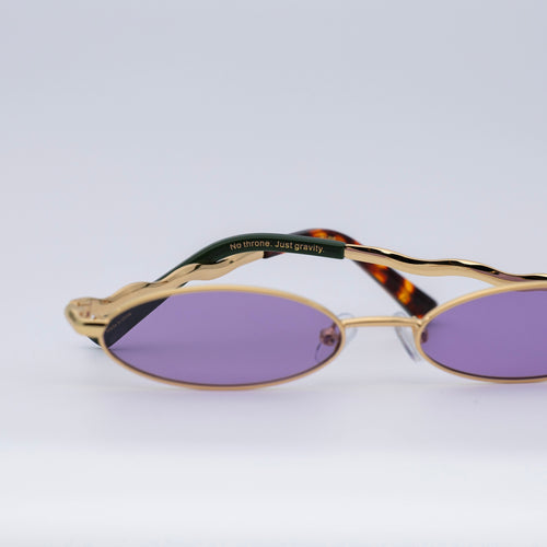 • Design: Elegant gold frame with luminous violet lenses.