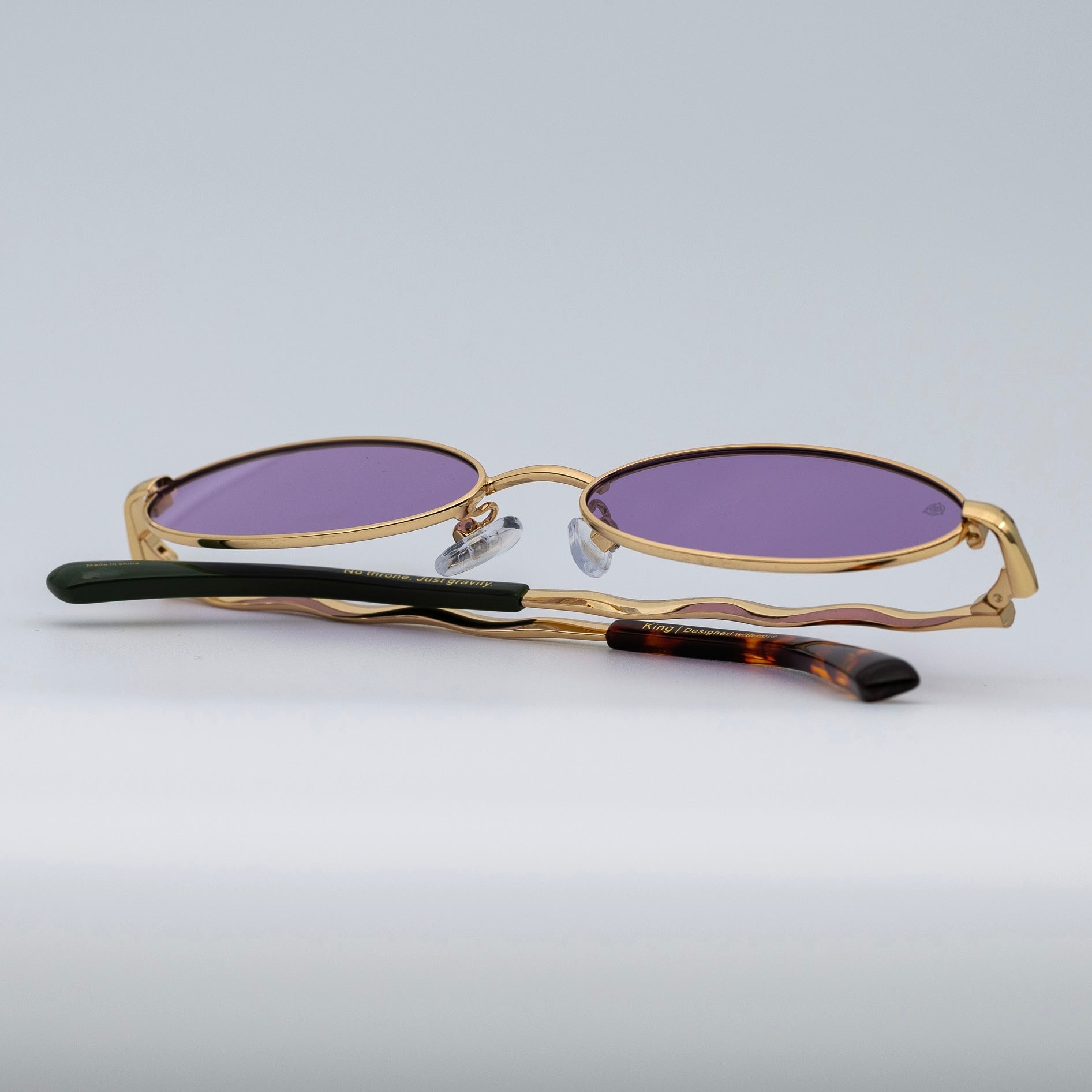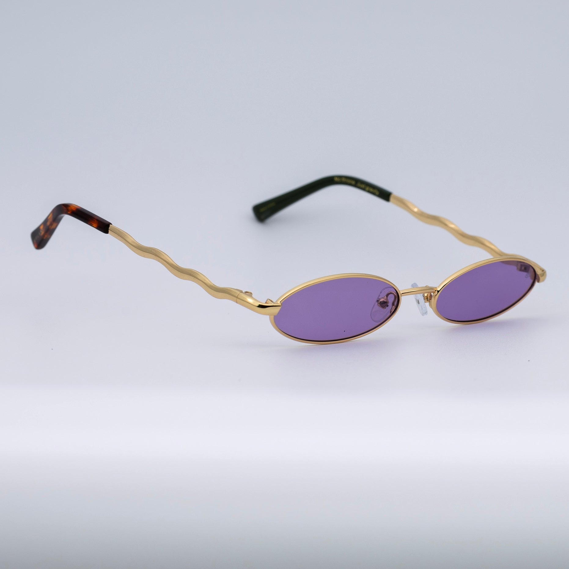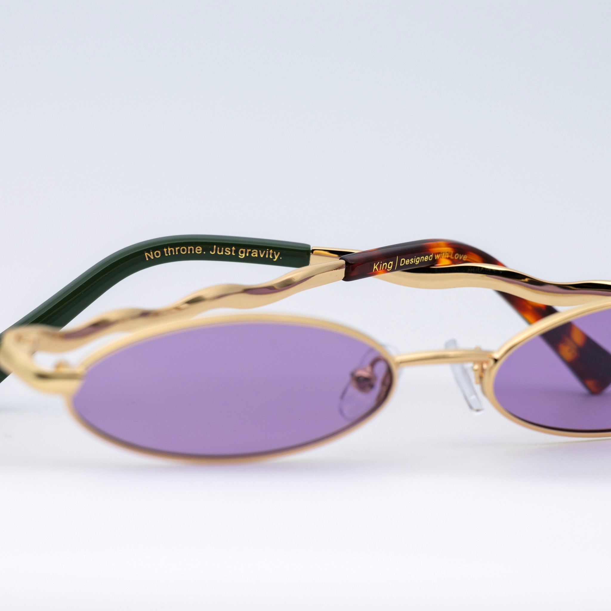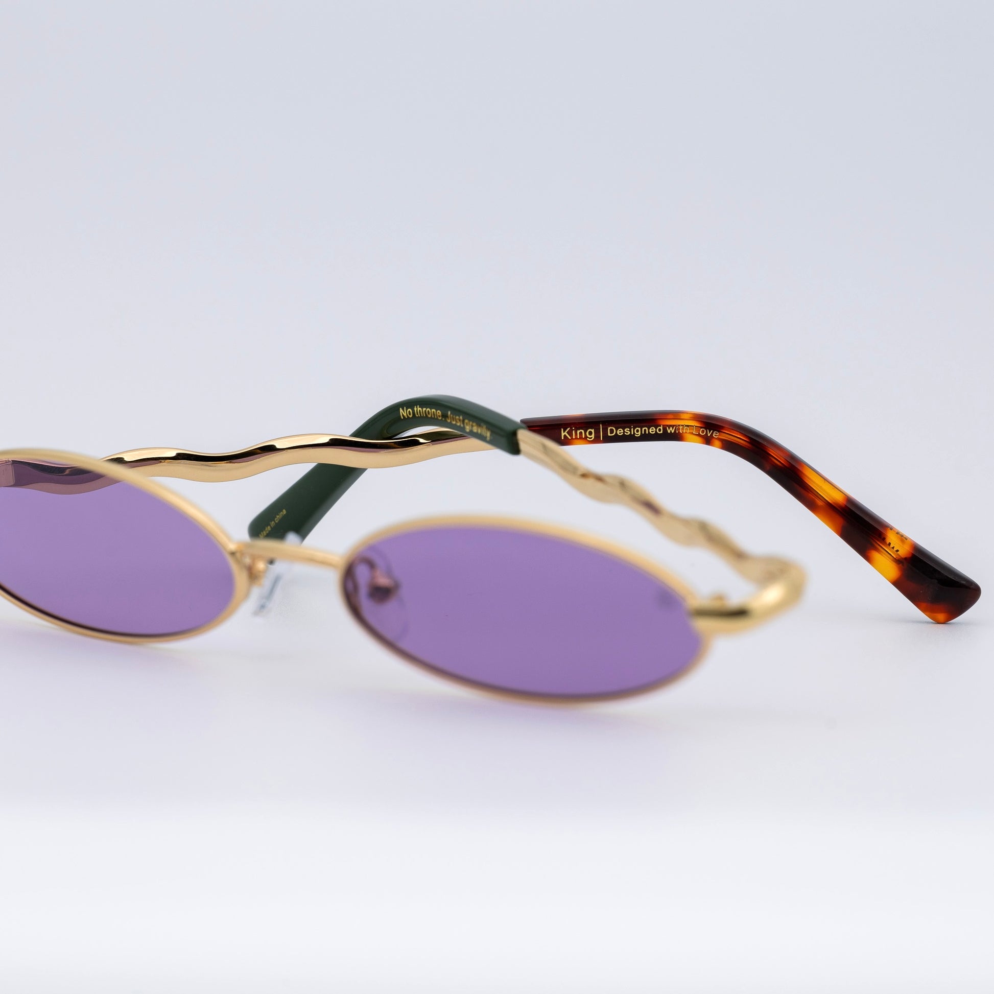 • Design: Elegant gold frame with luminous violet lenses.