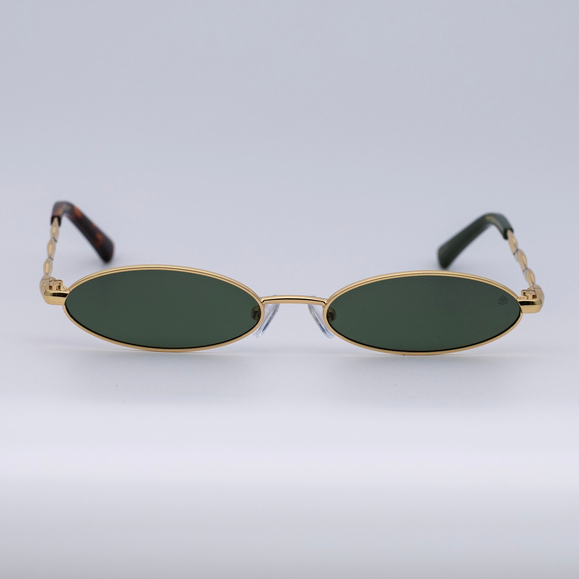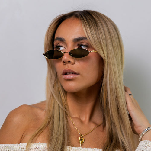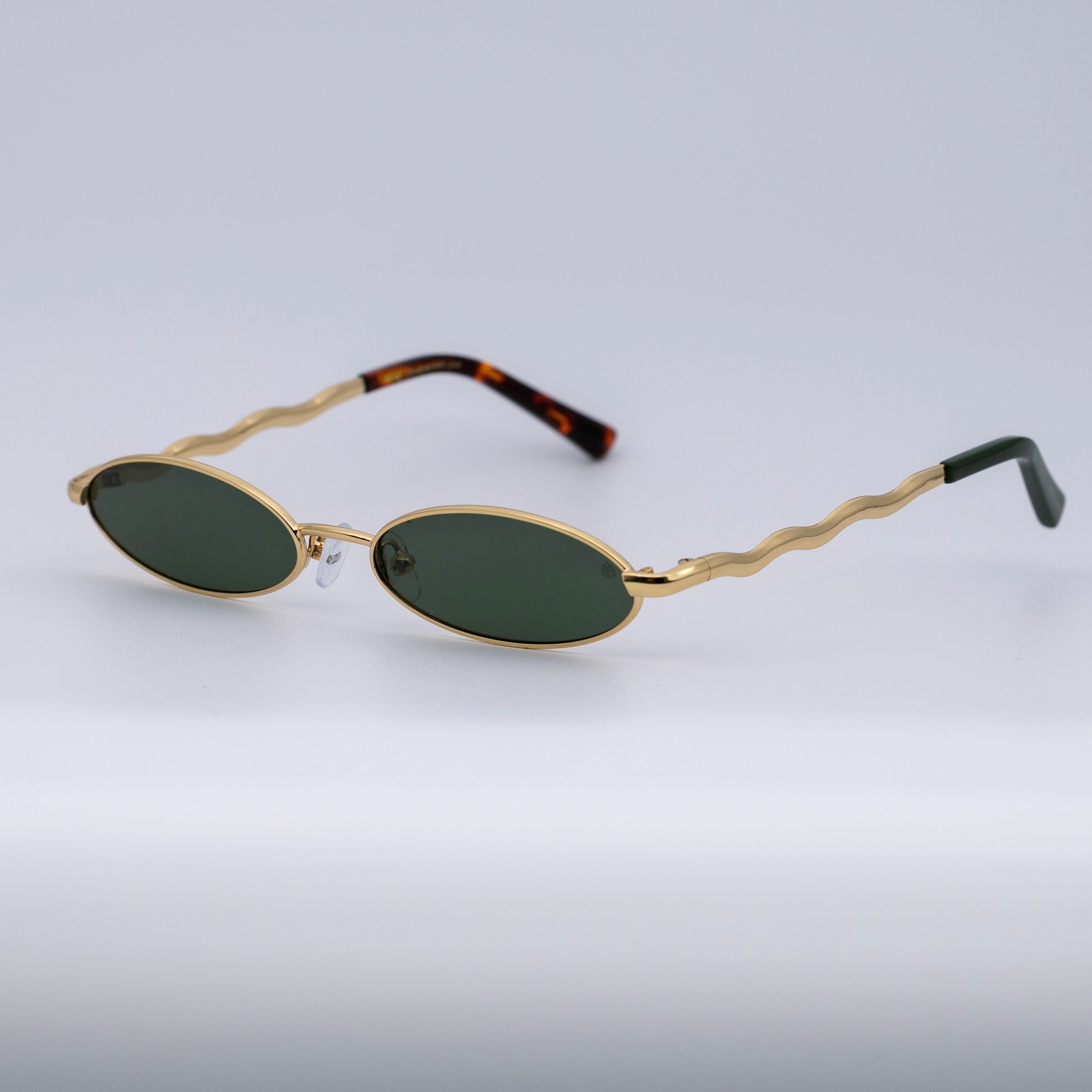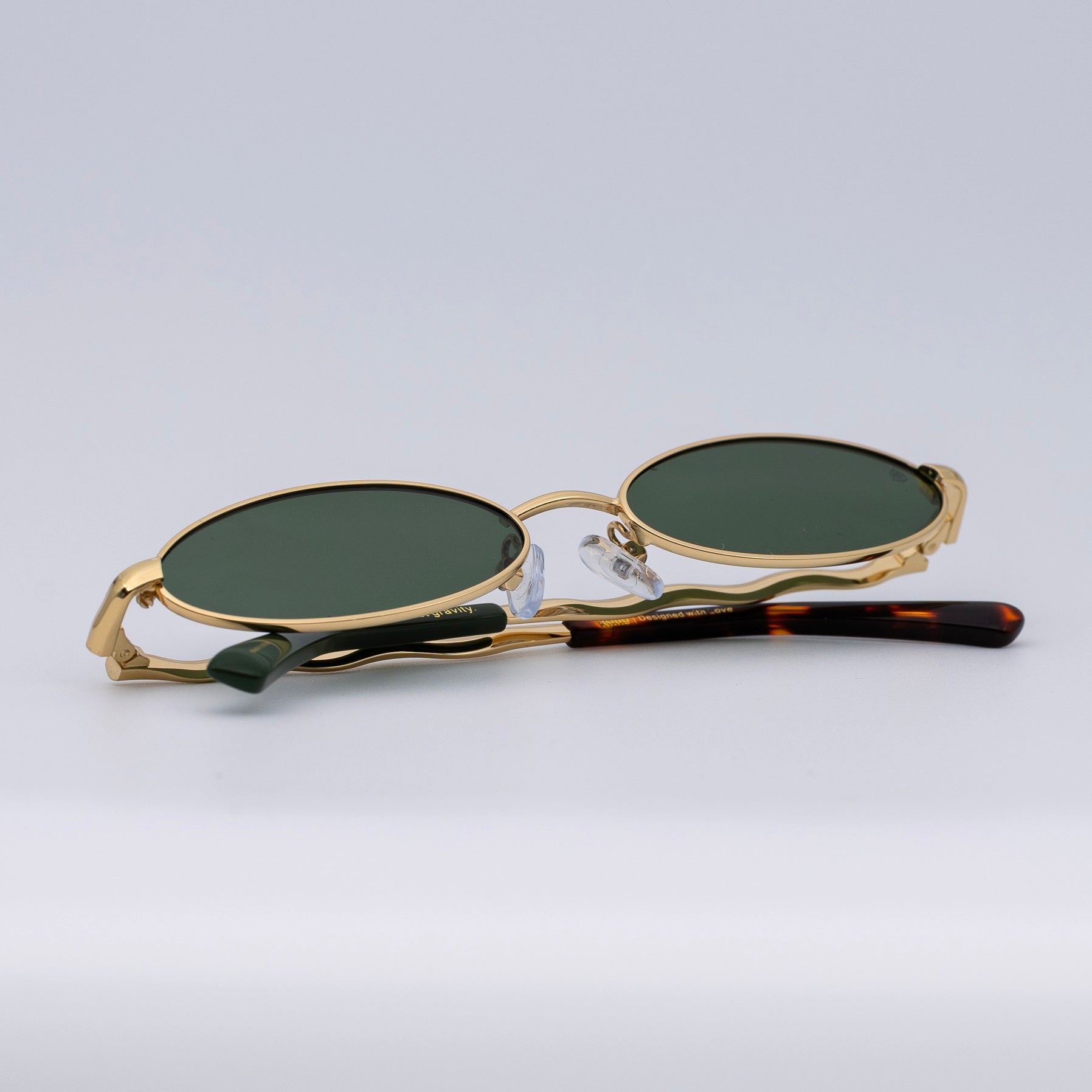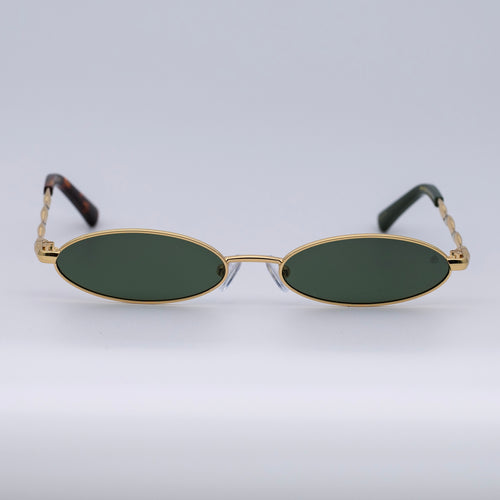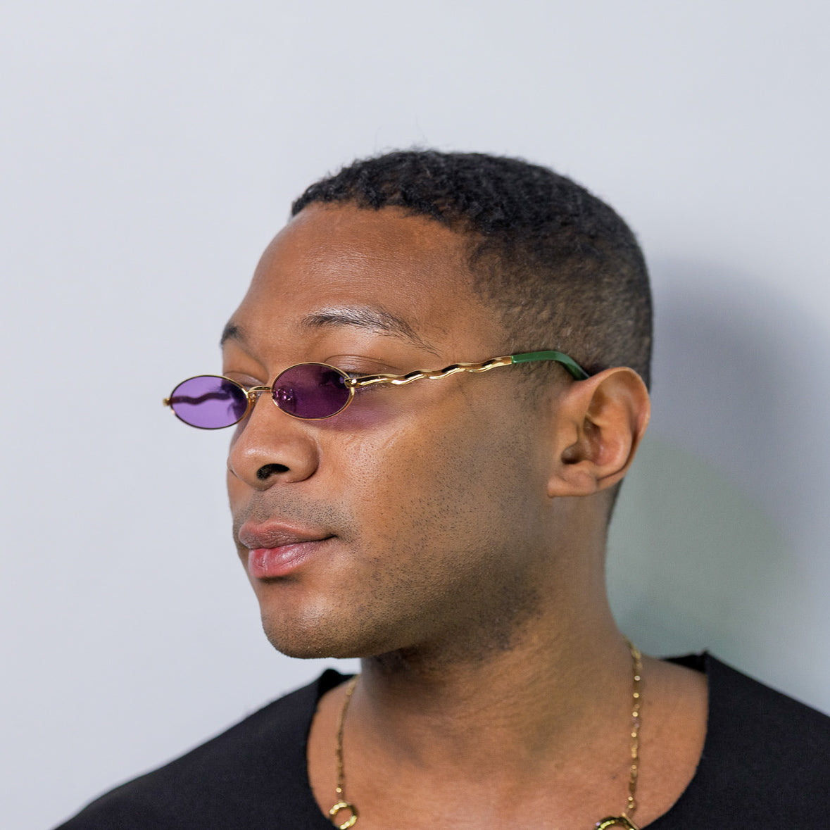 • Design: Elegant gold frame with luminous violet lenses.